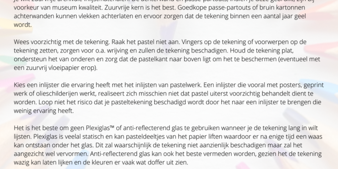 Het spreekt voor zich dat je je tekening natuurlijk zo lang mogelijk mooi wilt houden. Daarom ontvang je, wanneer ik een tekening voor jou heb gemaakt, ook altijd een instructie hoe je zo lang mogelijk van de tekening kunt genieten.